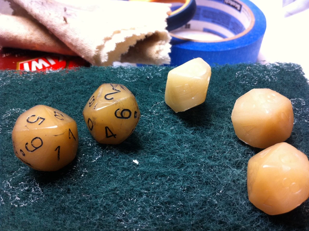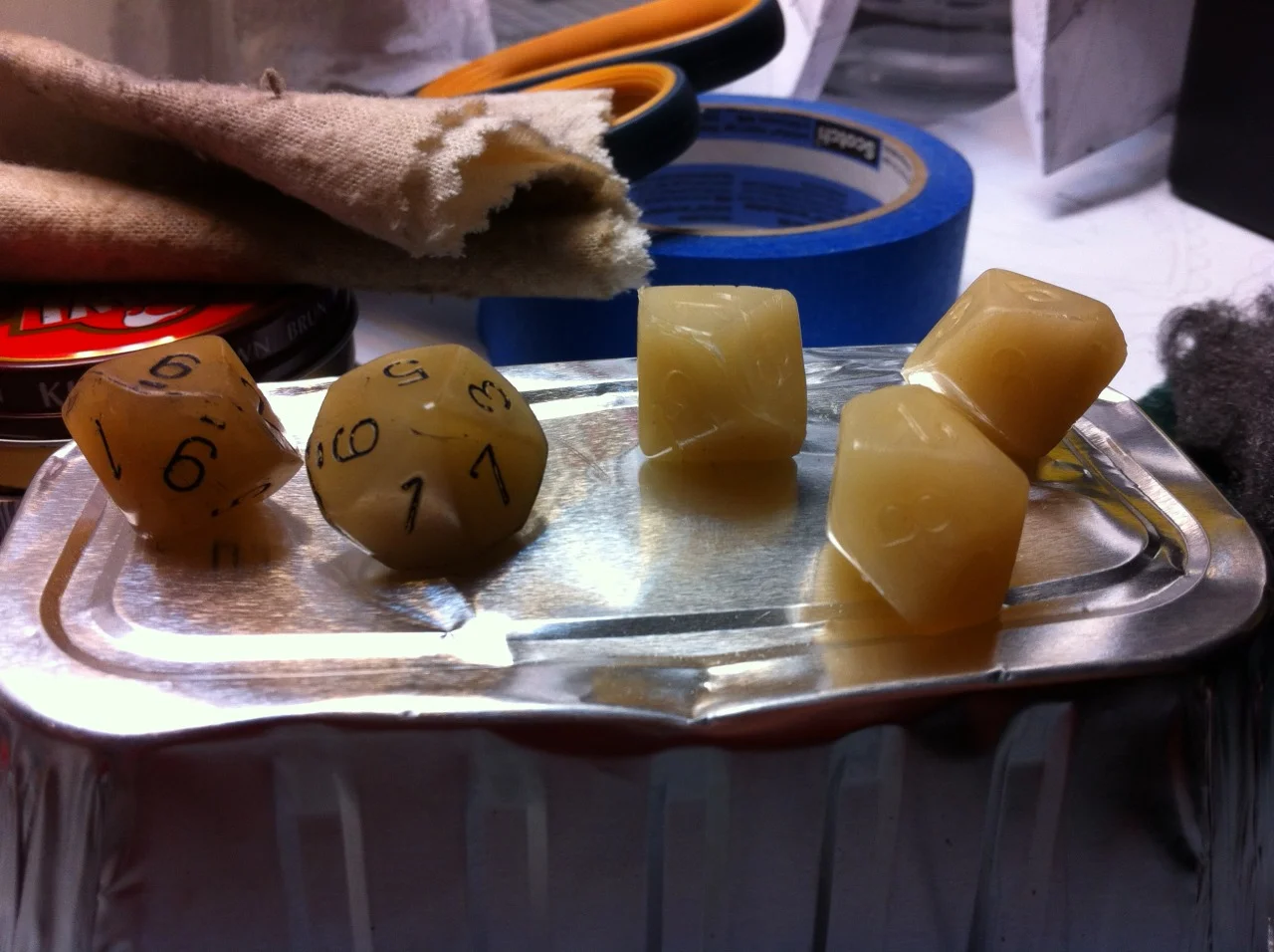 Bone Dice! My first real attempt at mold-making. 2-part silicone mold to press out the shape. Used a mix of clear, white, and yellow Sculpy to get the right shade with a slight translucence. Finished with a bit of red and black shoe polish.